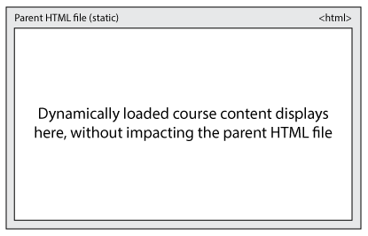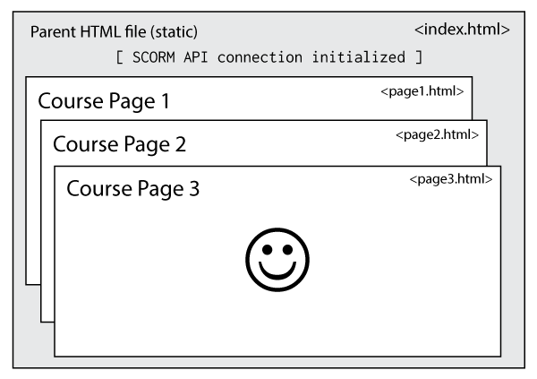 The original technique recommended by the authors of SCORM is the traditional frameset, where an HTML file serves as a parent and loads HTML files as-needed into a child frames. In this scenario, the learner can navigate between child frames without unloading the parent frame. The child frames use JavaScript to send data to the parent frame, which keeps track of all course progress, and, in turn, reports the progress to the LMS via the SCORM API.